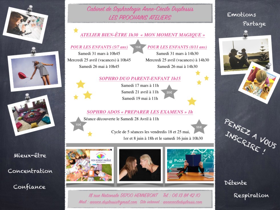 Un nouveau groupe de sophrologie commence pour ce troisième trimestre (Le jeudi ou vendredi midi, à confirmer avec les inscrits). Les groupes du cabinet sont volontairement restreints à 4 personnes afin de conserver une certaine intimité. N’hésitez pas à me contacter.