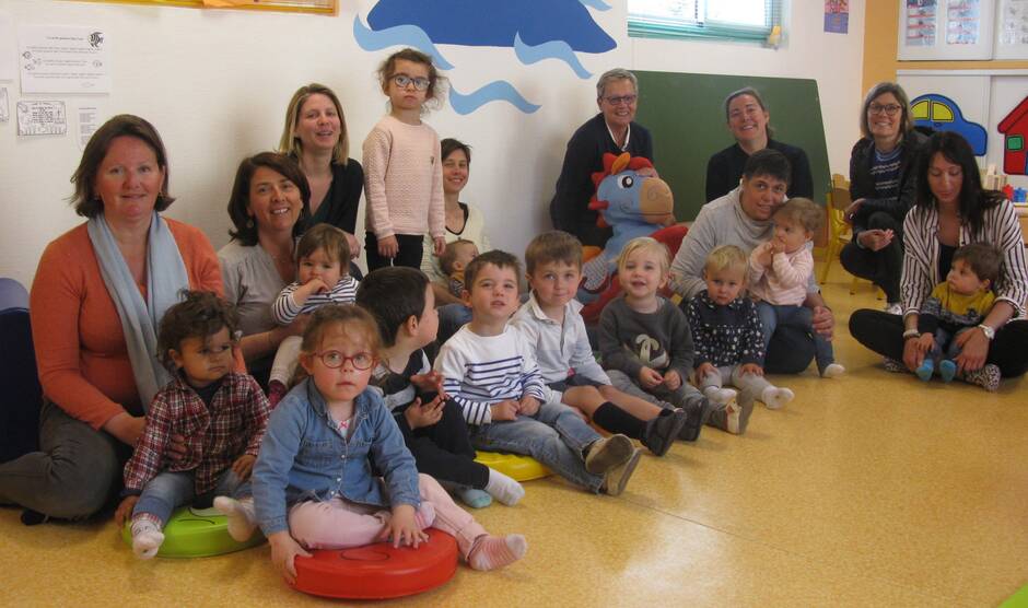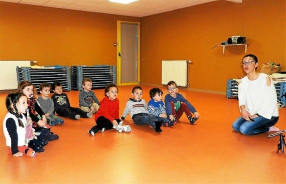 Les mamans et leurs enfants écoutent Anne-Cécile en début de séance samedi après-midi.